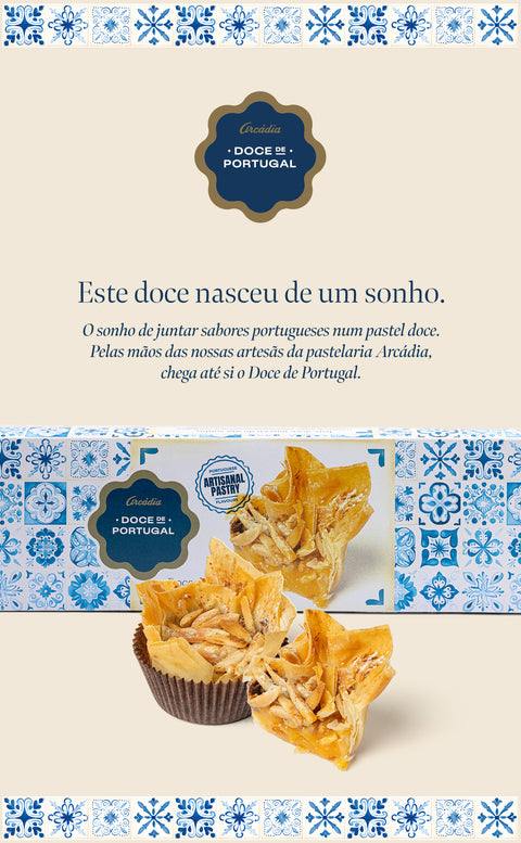 Proveniente de un sueño, el Dulce de Portugal rinde homenaje a la repostería tradicional Portuguesa, de Norte a Sur de Portugal, en los Azores y en Madeira. Este dulce se elabora de forma artesanal por nuestras maestras pasteleras con todo el cuidado y cariño característico de los productos de Arcádia.